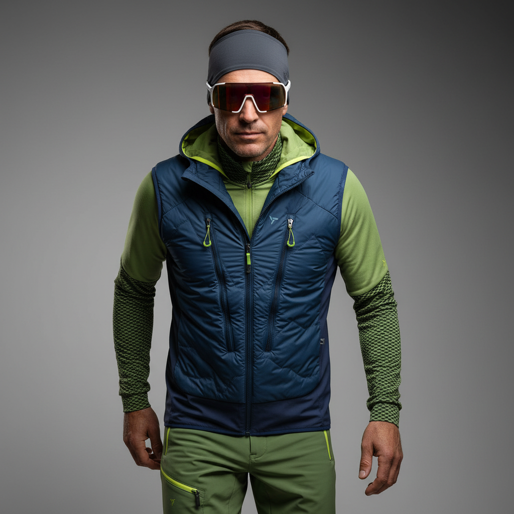 Pánská zateplená skialpová vesta s odepínací kapucí a kapsami na stoupací pásy. Je vyrobena z větruodolného materiálu Windbreaker a QuatroFLEX Shell s izolací Primaloft® Gold Insulation Active 40 g.