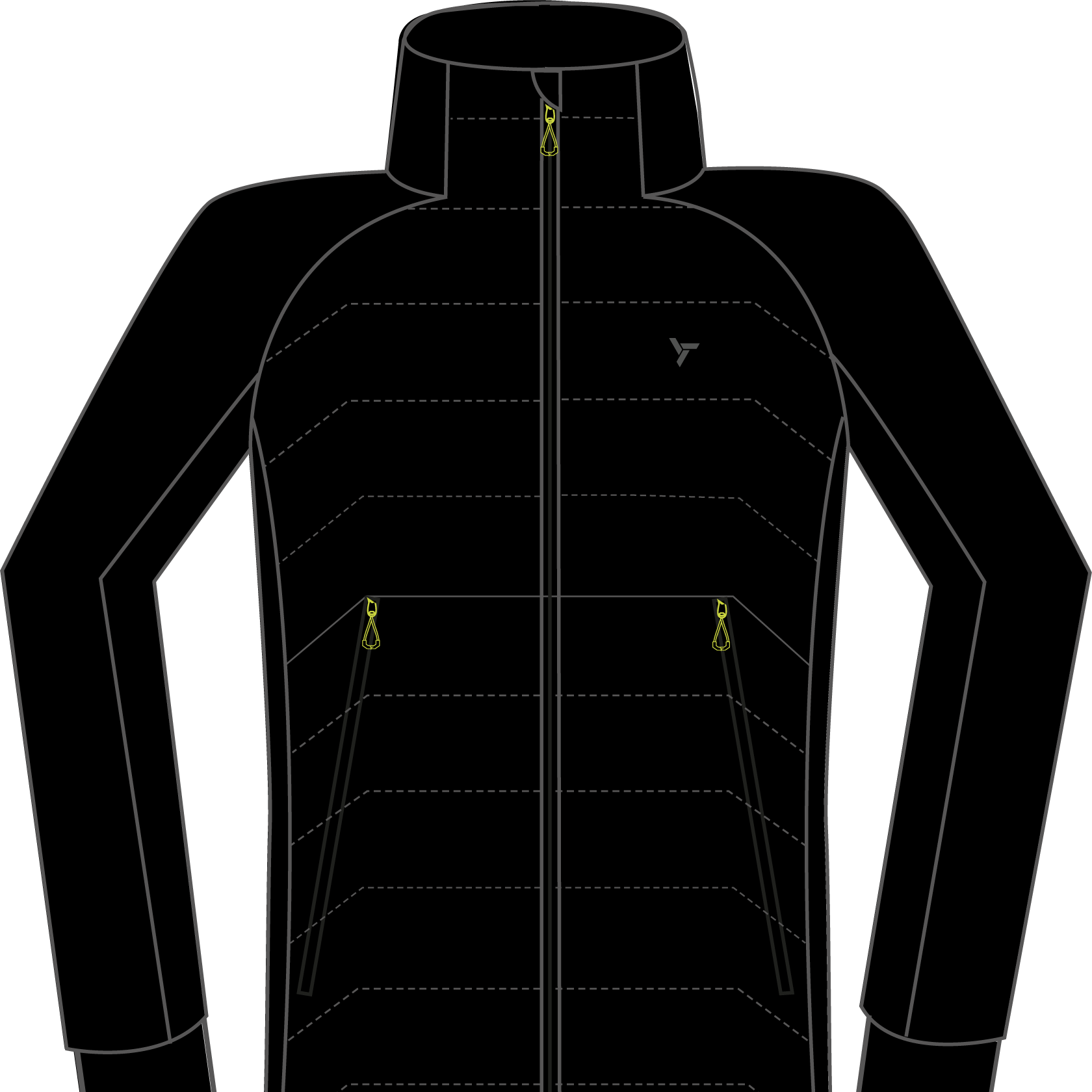 Men’s hoodie in elastic QuatroFLEX Therm, front insulated with Primaloft, with two zip pockets. Perfect as a mid-layer for ski touring, cross-country skiing, and other sports.