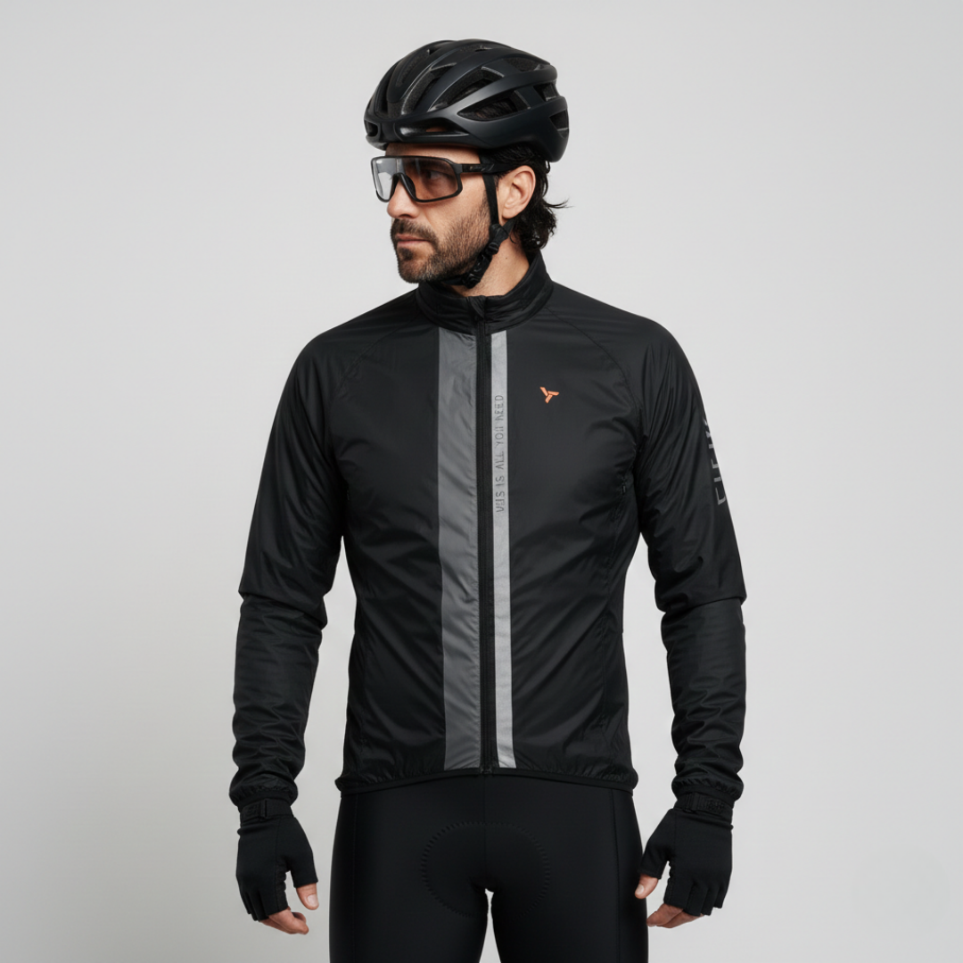 Pánská cyklistická bunda je vyrobena z větruvzdorného, lehkého a hustě tkaného materiálu. Je sbalitelná, a kapuci lze složit do límce. Má prodloužený zadní díl, odvětrání na zádech a reflexní prvky.