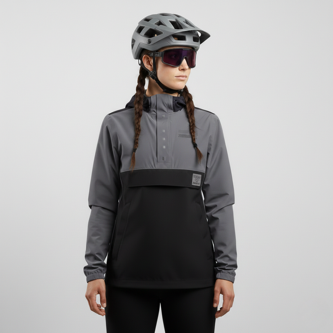 Women's jacket designed for riding on a gravel bike, equipped with a powerful Power Strong membrane. It has a loose fit, an extended back, a detachable hood and several practical pockets and reflective elements.